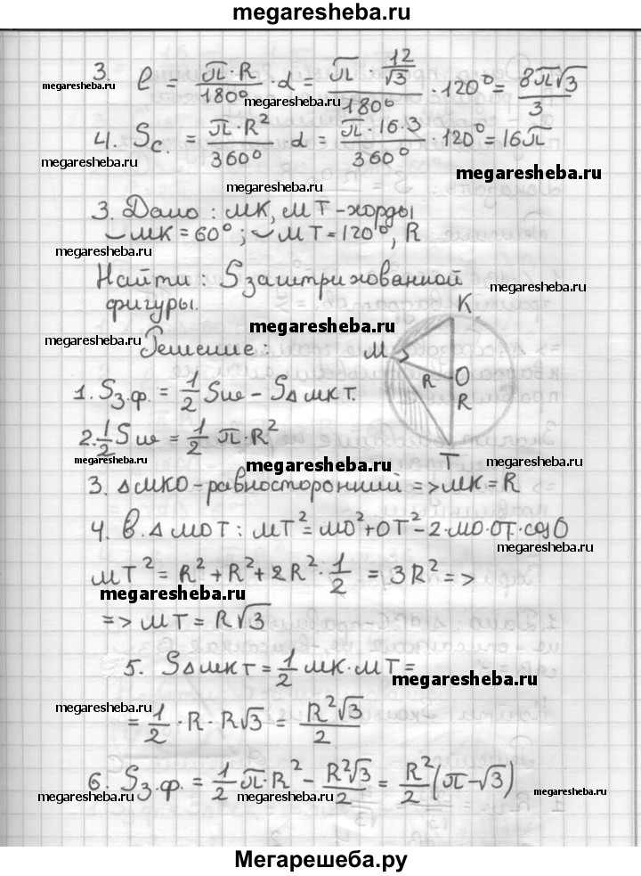 Вариант 3 1. В квадрат вписана окружность и около него описана окружность. Длина большей окружности равна 8л. Найдите площадь кольца и площадь квадрата. 2. Хорда окружности равна 12 и стягивает дугу в 120°. Найдите длину дуги и площадь соответствующего сектора. 3. На рисунке 58 хорды МК и МТ стягивают дуги в 60° и 120°. Радиус окружности равен R. Найдите площадь заштрихованной фигуры. 4*. Докажите, что площадь правильного 2гс-угольника равна —|—, где R — радиус описанной окружности, ап — сторона правильного «-угольника, вписанного в ту же окружность.