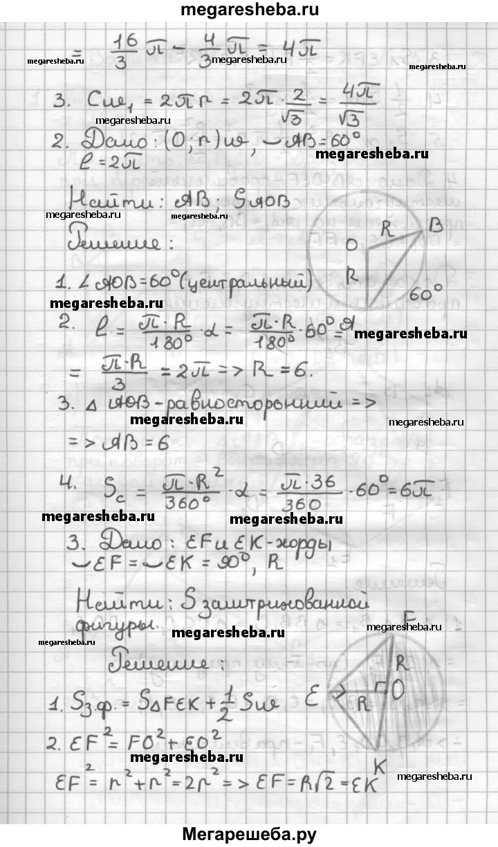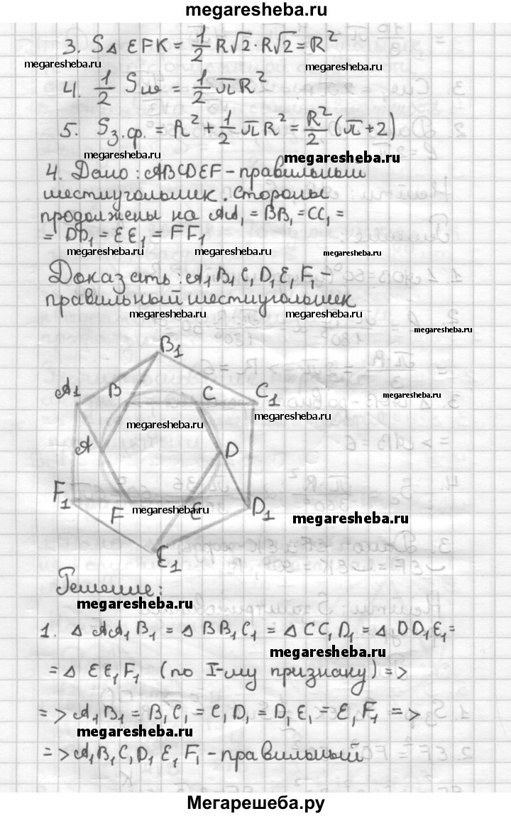 К—4 Вариант 4 1. Около правильного треугольника описана окружность и в него вписана окружность. Сторона треугольника равна 4. Найдите площадь кольца и длину меньшей окружности. 2. Хорда стягивает дугу в 60°. Длина дуги равна 2п. Найдите длину хорды и площадь "соответствующего сектора. 3. На рисунке 59 хорды EF и ЕК стягивают дуги в 90°. Радиус окружности равен R. Найдите площадь заштрихованной фигуры. 4*. ABCDEF — правильный шестиугольник. Стороны FA, АВ, ВС, CD, DE и EF продолжены за вершины А, В, С, D, Е и F на равные отрезки ААХ, ВВССХ, DDX, ЕЕХ и FFX. Докажите, что AlBlDlC1ElF1 — правильный шестиугольник. 83