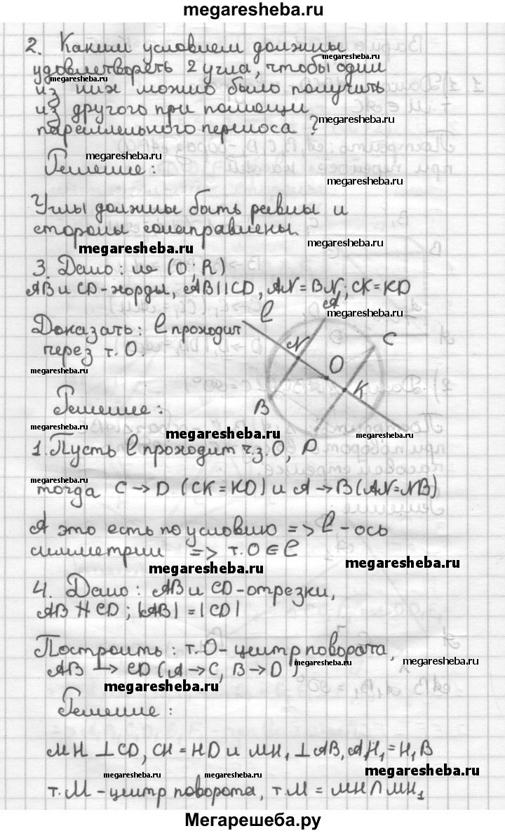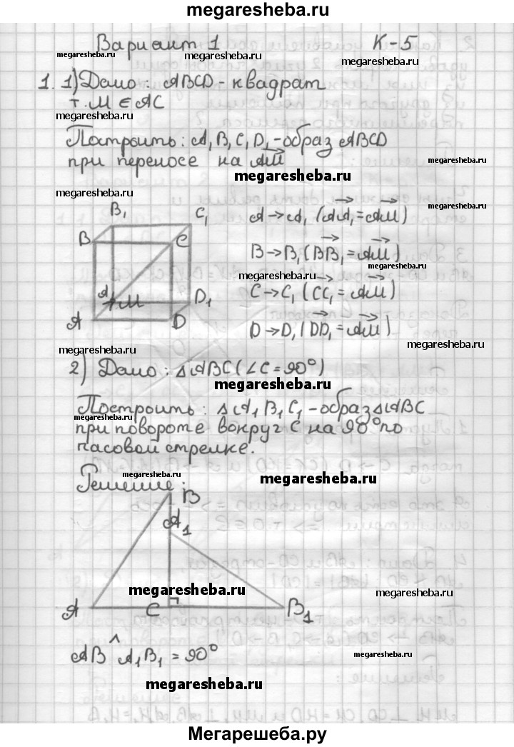 К—2 - Вариант 2 1. 1) Начертите квадрат ABCD и отметьте на диагонали точку М, не совпадающую с точкой пересечения диагоналей. Постройте образ этого квадрата при переносе на вектор AM. 2) Дан прямоугольный треугольник ABC (ZC = 90°). Постройте его образ при повороте вокруг центра С на 90° по часовой стрелке. Чему равен угол между АВ и АХВХ, если АВ АХВХ? 2. Каким условиям должны удовлетворять два угла, чтобы один из них можно было получить из другого при помощи параллельного переноса? 3. Докажите, что прямая, содержащая середины двух параллельных хорд окружности, проходит через ее центр. 4*. Начертите два непараллельных отрезка АВ и CD, длины которых равны. Постройте центр поворота, отображающего отрезок АВ на CD (А —*■ С; В —*■ D).