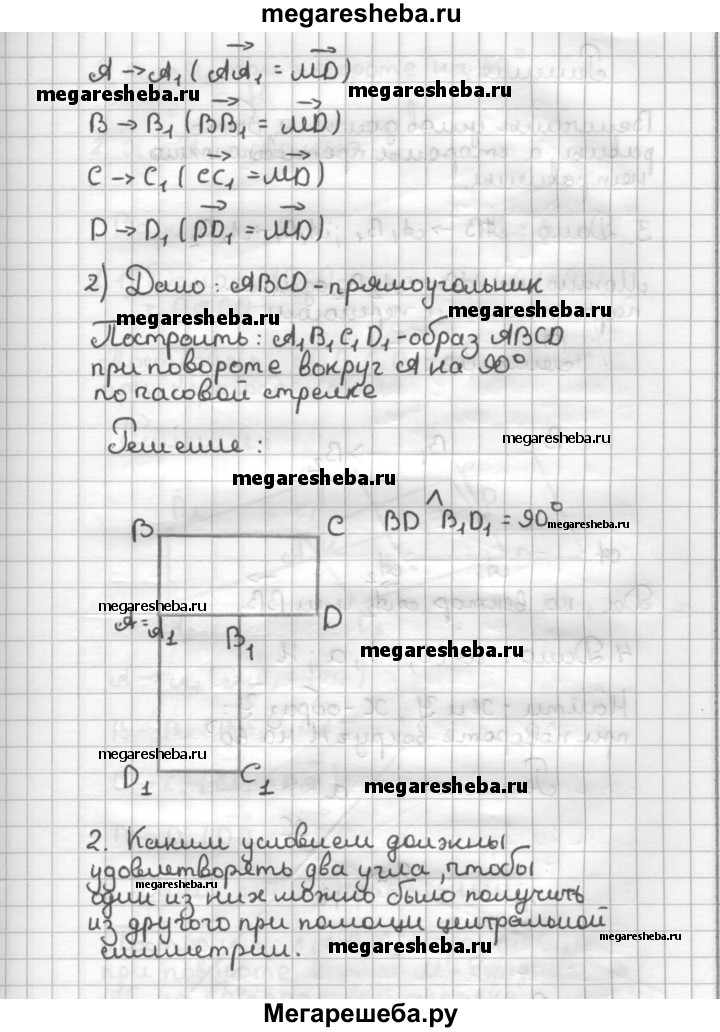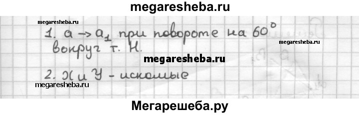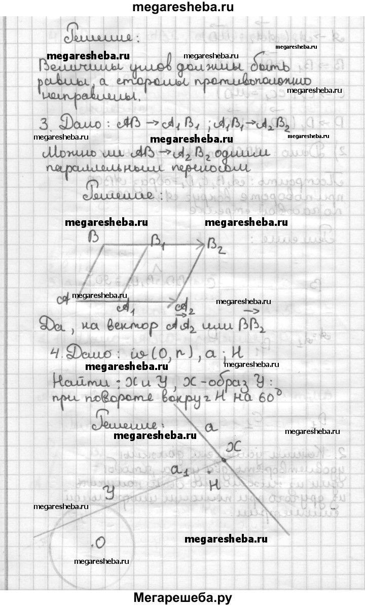 Вариант 3 1. 1) Начертите трапецию ABCD (AD и ВС — основания) и отметьте на диагонали BD точку М. Постройте образ этой трапеции при переносе на вектор MD. 2) Начертите прямоугольник ABCD и постройте его образ при повороте вокруг центра А на 90° по часовой стрелке. Чему будет равен угол между BD и BXDX, если В —>• Б, и D DJ 2. Каким условиям должны удовлетворять два угла, чтобы один из них можно было получить из другого при помощи центральной симметрии? 3. Отрезок АВ отображается параллельным переносом на отрезок АХВХ, который другим параллельным переносом отображается на отрезок А2В2. Можно ли отрезок АВ отобразить на А2В2 одним параллельным переносом? Сделайте рисунок и укажите соответствующий вектор. 4*. На данных окружности и прямой найдите такие пары точек, что одна точка является образом другой при повороте вокруг данной точки Н на 60° (рис. 61).