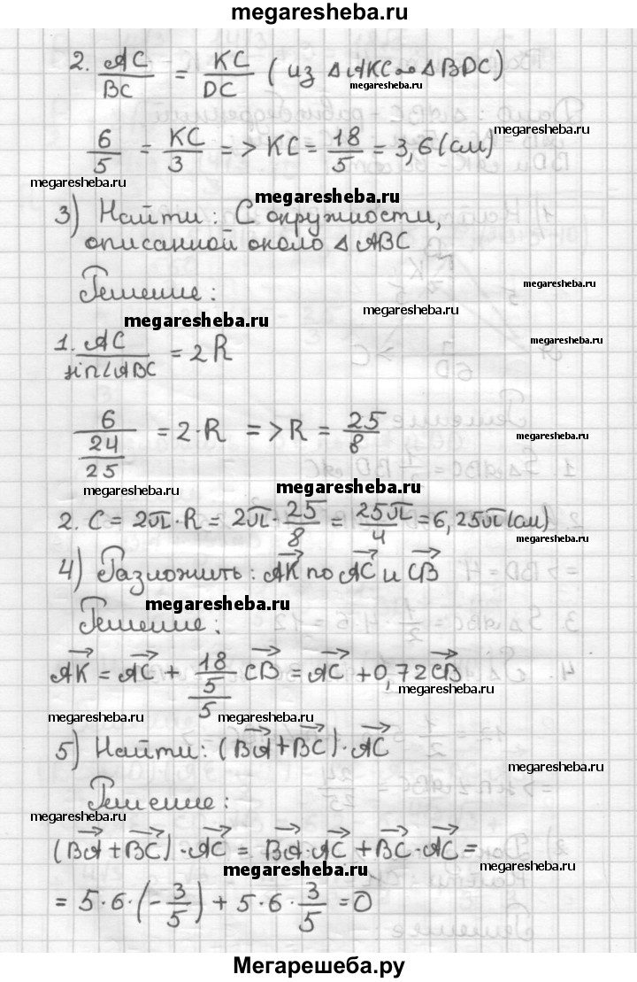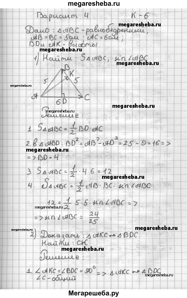 К—6 Вариант 4 В равнобедренном треугольнике ABC АВ = ВС = 5 см, АС = 6 см, BD и АК — высоты. 1) Найдите площадь треугольника ABC и sin ∠ABC. 2) Докажите, что треугольники АКС и BDC подобны, и найдите длину СК. 3) Найдите длину окружности, описанной около треугольника ABC. 4) Разложите вектор АК по векторам АС и СВ. 5) Вычислите (ВА + ВС) • АС.
