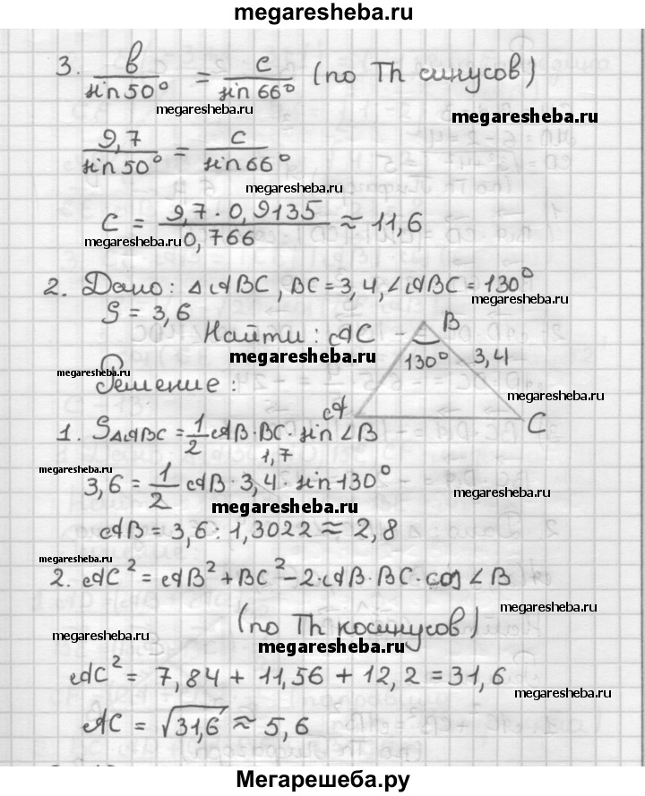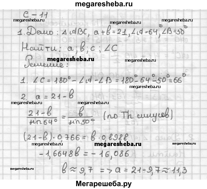 С—11 1. В треугольнике ABC a + b = 21, ∠A = 64°, ∠B = 50°. Найдите неизвестные элементы треугольника. 2. В треугольнике ABC ВС = 3,4, ∠ABC = 130°. Площадь треугольника равна 3,6. Найдите АС.
