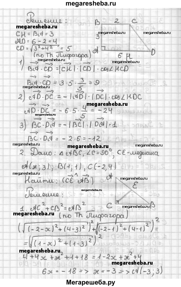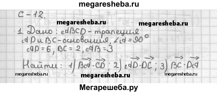 С—12 1. В прямоугольной трапеции ABCD (AD и ВС — основания) ∠A = 90°, AD = 6, ВС = 2, АВ = 3. Найдите скалярное произведение: 1) ВА * CD; 2) AD * DC; 3) ВС * DA. 2. В прямоугольном треугольнике ABC (∠C = 90°) А(х; 3), В(1; 1) и С(-2; 4). Используя микрокалькулятор, найдите угол между медианой СЕ и гипотенузой АВ.