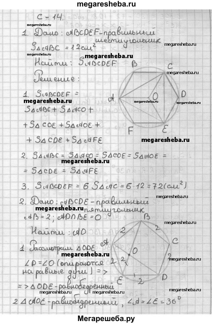С—14 1. ABCDEF — правильный шестиугольник. Площадь треугольника ABC равна 12 см2. Найдите площадь шестиугольника. 2. Сторона правильного пятиугольника ABCDE равна 2. Диагонали AD и BE пересекаются в точке О. Найдите АО.