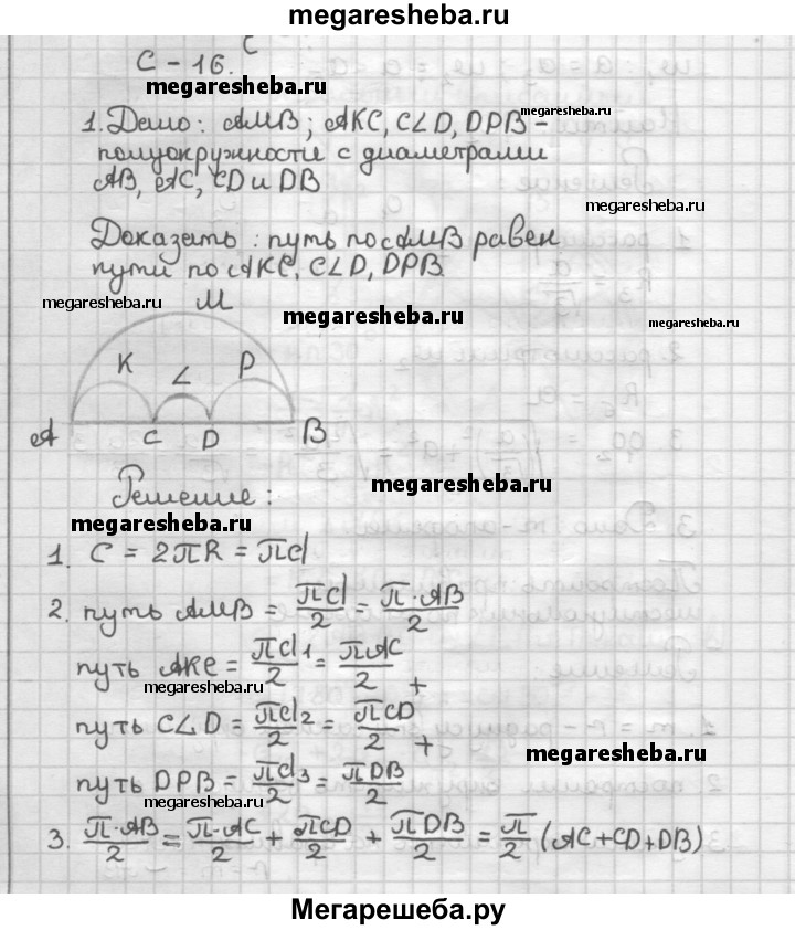 С—16 1. На рисунке 26 AMВ, АКС, CLD, DP В — полуокружности с диаметрами АВ, AC, CD и DB. Докажите, что путь от А до В по полуокружности АМВ равен пути по полуокружностям АКС, CLD и DPB.