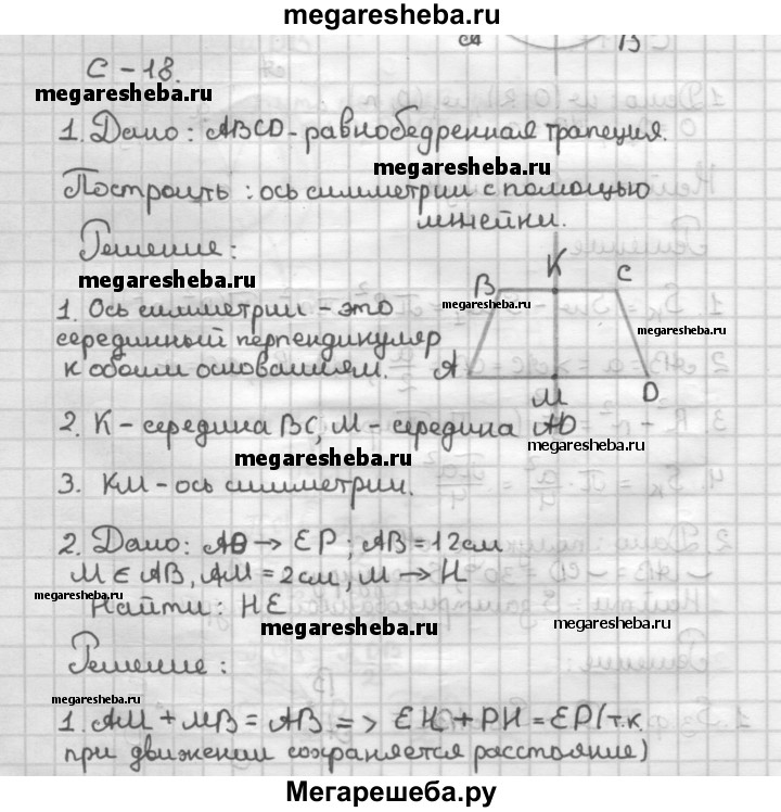 С—18 1. При помощи одной линейки постройте ось симметрии равнобедренной трапеции. 2. При некотором движении отрезок АВ отображается на отрезок ЕР, АВ = 12 см. Точка М принадлежит отрезку АВ, AM - 2 см. Точка М отображается на точку Н. Найдите НЕ.
