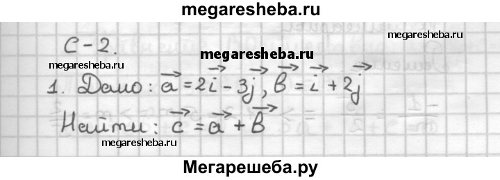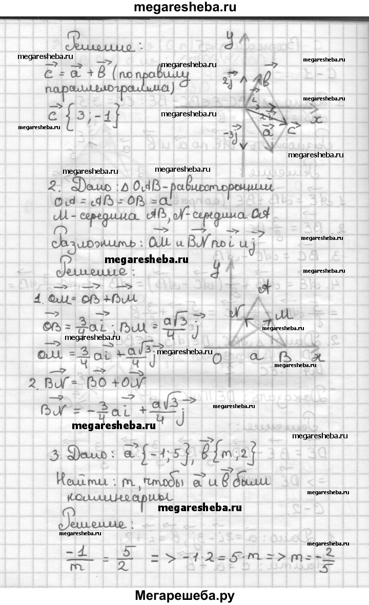 С—2 1. a =2i -3j, b-i+2j. Постройте вектор, равный сумме векто- ров а и Ь. Какие координаты имеет этот вектор? 2. На рисунке 25 треугольник ОАВ равносторонний со стороной, равной а. Разложите векторы ОМ и BN по координатным векторам i и у, если М и N — середины сторон АВ и OA. 3. а {-1; 5}, b {т; 2}. При каких значениях т. эти векторы будут коллинеарными?