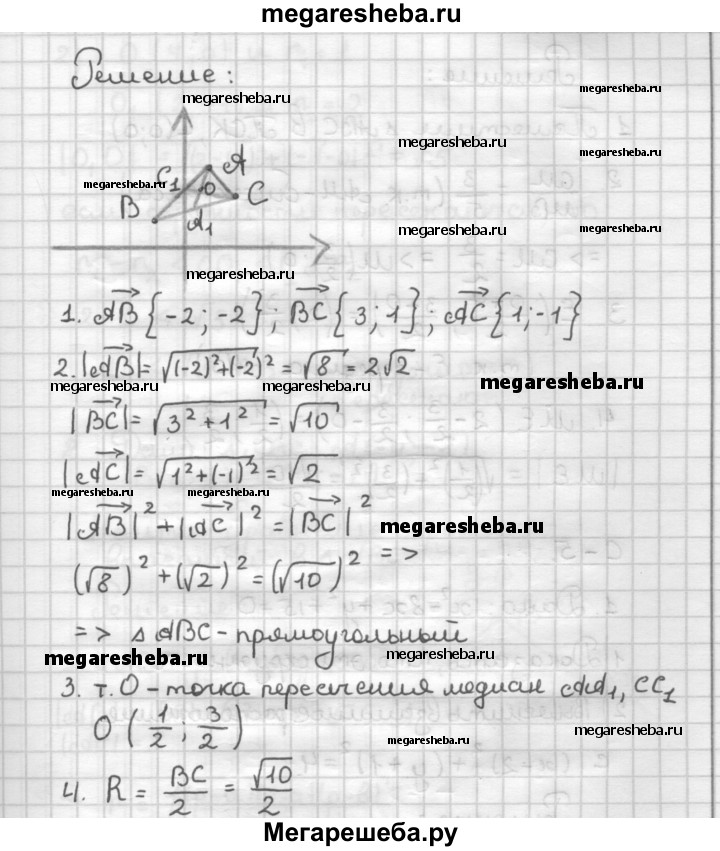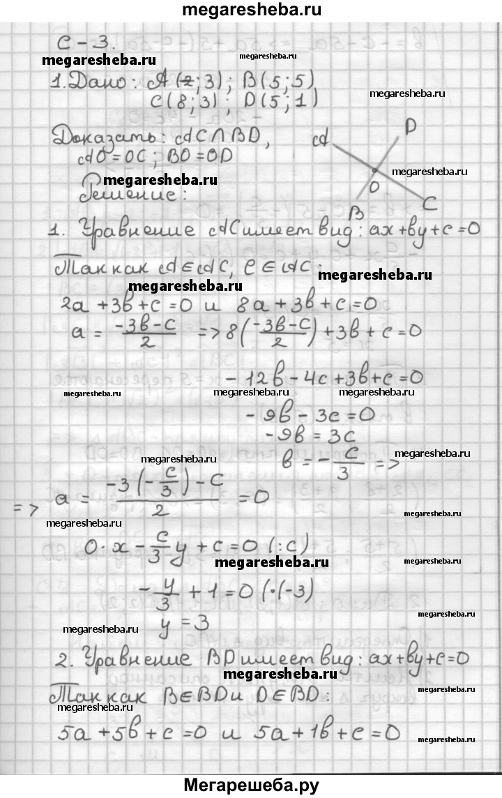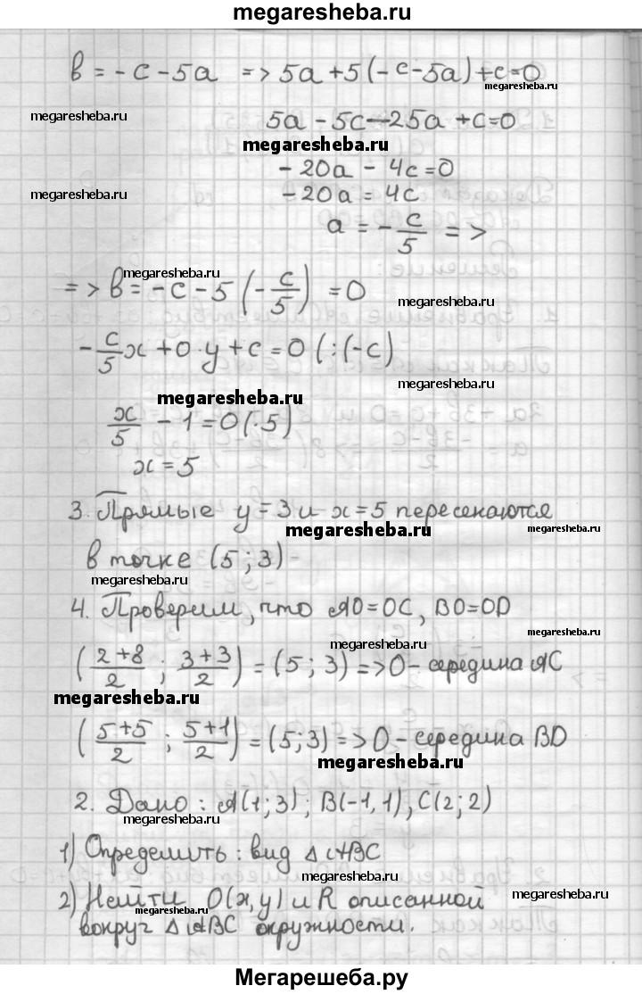 С-3. 2. Даны точки А(2; 3), В(5; 5), С(8; 3) и D(5; 1). Докажите, что отрезки АС и BD пересекаются и точкой пересечения делятся пополам. Треугольник задан координатами своих вершин: А(1; 3), В(-1; 1), С(2; 2). Определите вид треугольника. Найдите координаты центра описанной вокруг треугольника окружности и ее радиус.