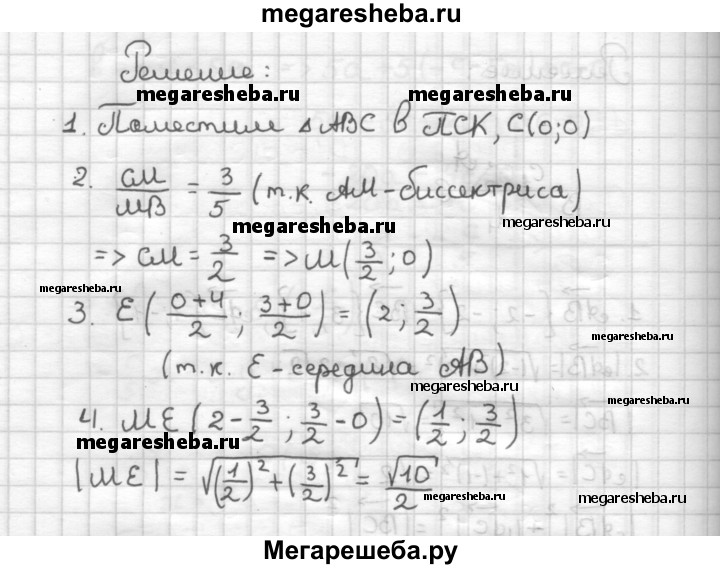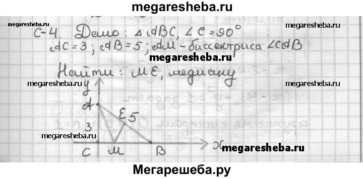 С—4 В прямоугольном треугольнике ABC (∠S = 90°) АС = 3, АВ = 5, AM —j биссектриса угла CAB. Найдите длину медианы ME треугольника АМВ:29