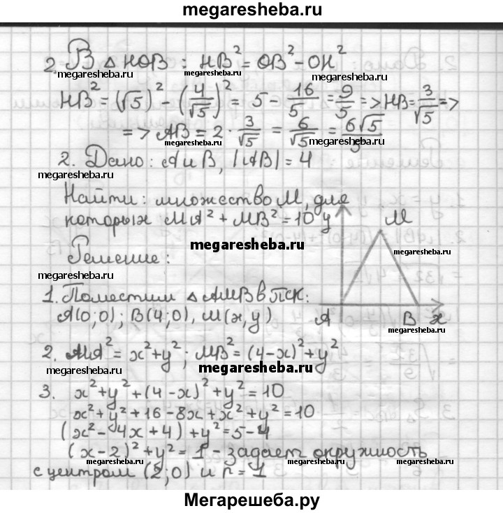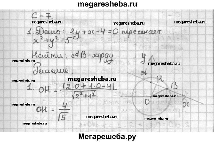 С—7 1. Прямая 2у + х - 4 = 0 пересекает окружность х2 + у2 = 5. Найдите длину хорды, которая отсекается этой окружностью на прямой. 2. Даны две точки А к В, расстояние между которыми равно 4. Найдите множество всех точек М, для которых MA2 + MB2 = 10.