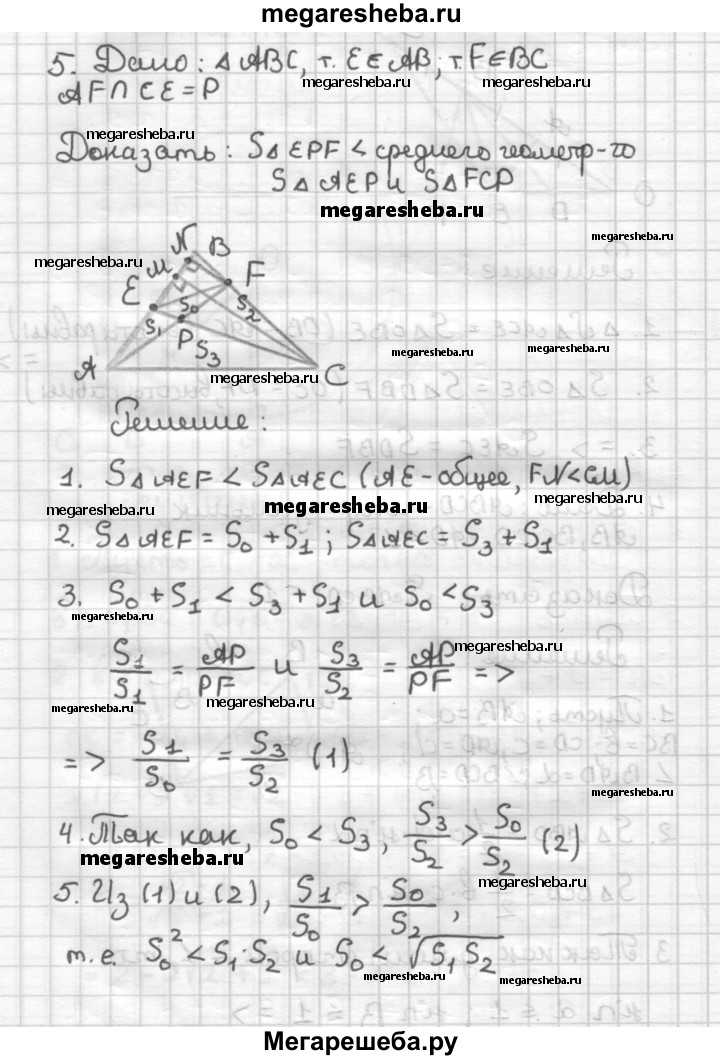 5. Точки Е и F лежат на сторонах АВ и ВС треугольника ABC. AF пересекает СЕ в точке Р. Докажите, что площадь треугольника EPF меньше среднего геометрического площадей треугольников АЕР и FCP.