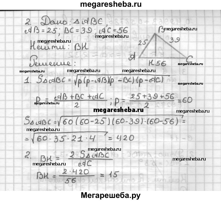 С—10 1. В треугольнике ABC АВ = 4√3, ВС = 3. Площадь треугольника равна 3√3. Найдите радиус описанной около треугольника окружности, если ее центр лежит внутри треугольника. 2. Стороны треугольника равны 25, 39, 56. Найдите высоту, опущенную на большую сторону.