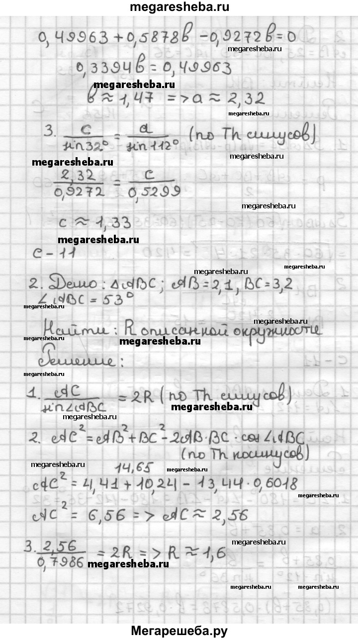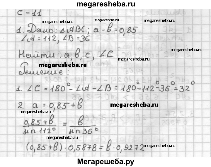 С—11 1. В треугольнике ABC а-b = 0,85, ∠A = 112°, ∠B = 36°. Найдите неизвестные элементы треугольника. 2. В треугольнике ABC АВ = 2,1, ВС = 3,2, ∠ABC = 53°. Найдите радиус окружности, описанной около треугольника.