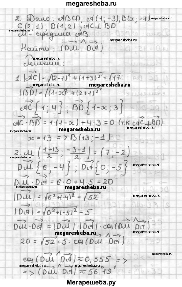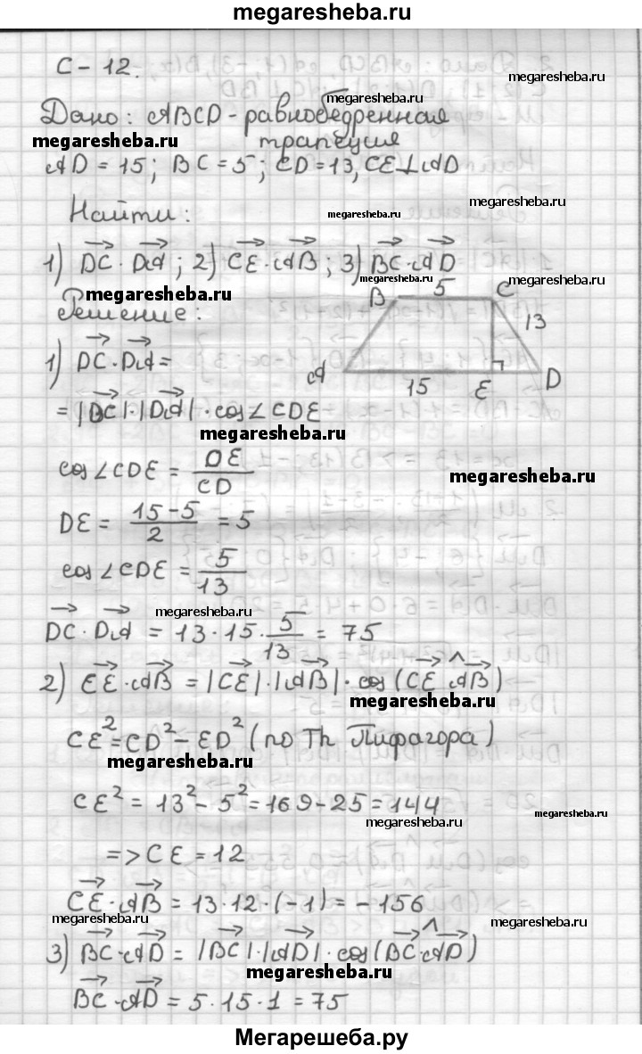 С—12 1. В равнобедренной трапеции ABCD основания AD и ВС соответственно равны 15 и 5, CD =13, СЕ ± AD. Найдите скалярное произведение: 1) DC * DA; 2) СЕ * АВ; 3) ВС * AD. 2. В четырехугольнике ABCD А( 1; -3), В(х; -1), С(2; 1), Z)(l; 2), AC _L BD, точка М — середина АВ. Используя микрокалькулятор, найдите угол между прямыми DM и DA. *