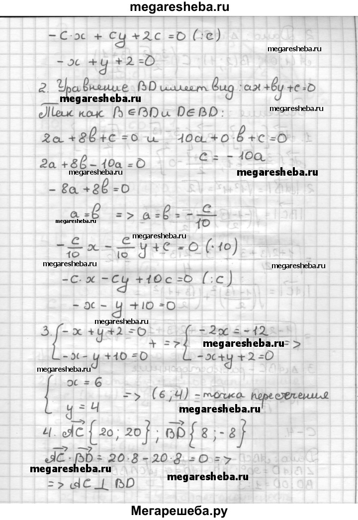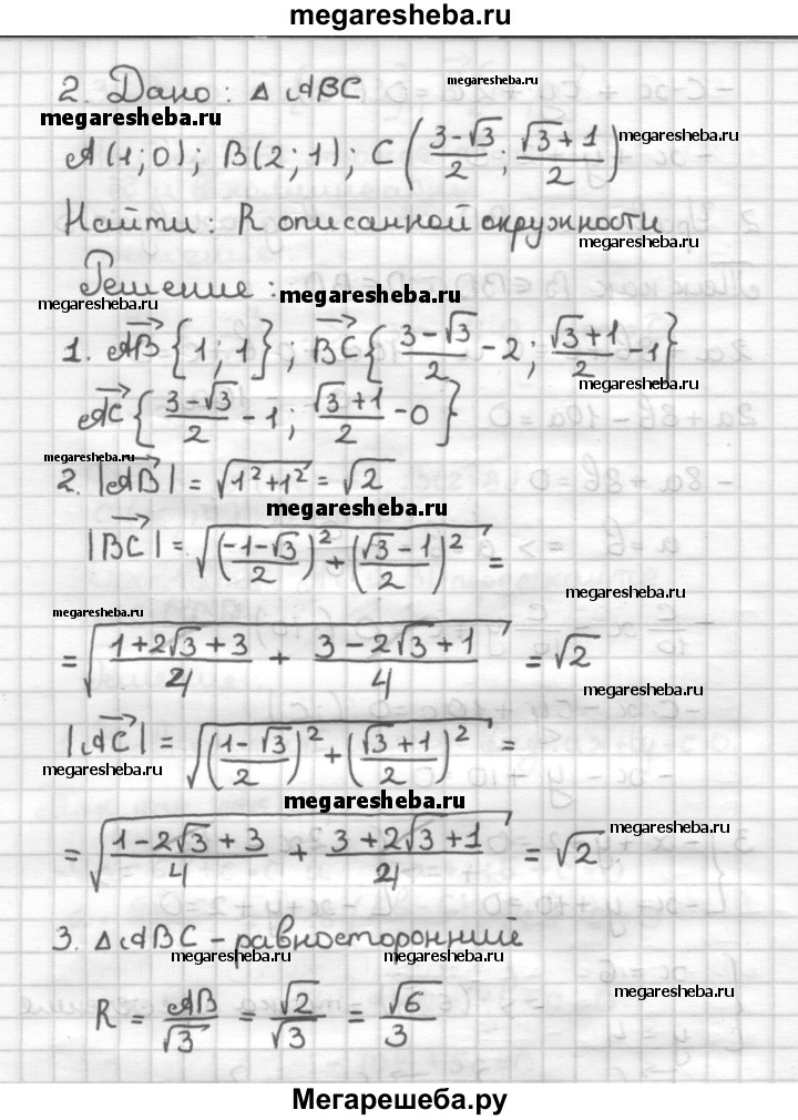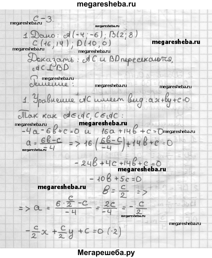 С—3 1. Даны точки А(-4; -6), В(2; 8), С(16; 14) и £>(10; 0). Докажите, что отрезки АС и BD пересекаются и взаимно перпендикулярны. 2. Треугольник задан координатами своих вершин А (1; 0), В (2; 1), С (3-√3/2 ; √3+1/2) Найдите радиус описанной вокруг треугольника окружности.