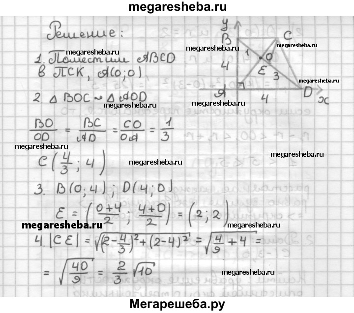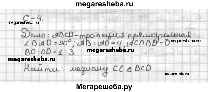 С—4 В прямоугольной трапеции ABCD AD и ВС — основания, ∠BAD = 90°, АВ = AD = 4, АС пересекает BD в точке О, причем ВО : OD = 1:3. Найдите длину медианы СЕ треугольника BCD.