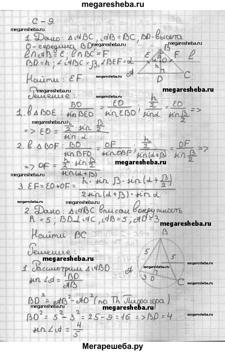 С—9 1. В треугольнике ABC АВ = ВС, BD — высота. Через середину высоты проведена прямая, пересекающая стороны АВ и ВС в точках Е и F соответственно. Найдите EF, если BD = h, ∠ABC = β и ∠BEF = α. 2. Треугольник ABC вписан в окружность, радиус которой равен 5, BD ⊥ АС (A—D—C), АВ = 5, AD = 3. Найдите ВС.