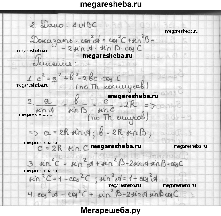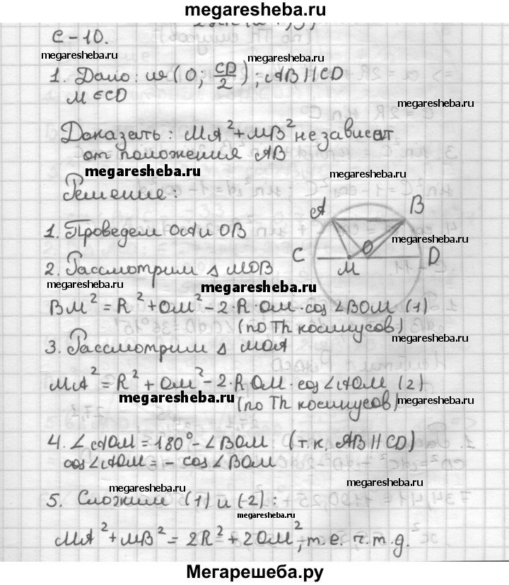 С—10 1. Пусть CD — диаметр окружности с центром в точке О и АВ — параллельная этому диаметру хорда. На диаметре CD выбрана точка М. Докажите, что сумма MA2 + MB2 не зависит от положения хорды АВ. 2. Докажите, что в любом треугольнике углы А, В и С связаны соотношением cos2 А = cos2 С -I- sin2 В - 2 sin A sin В cos С.