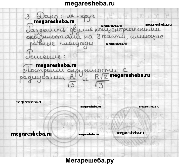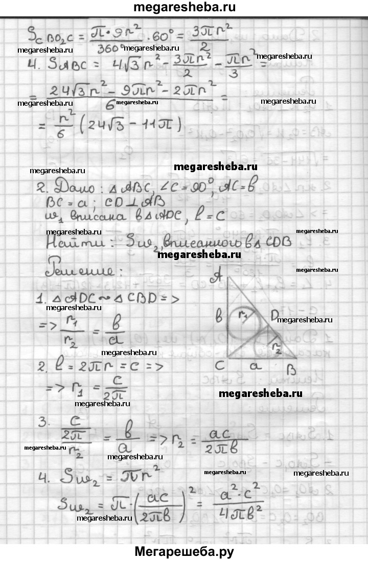 С—17 1. Две окружности, имеющие радиусы m и 3m, внешне касаются. АВ — их общая касательная. Найдите площадь заштрихованной фигуры, изображенной на рисунке 40. 2. ABC — прямоугольный треугольник (∠C = 90°), АС = b, ВС = a, CD ⊥ АВ. Длина окружности, вписанной в треугольник ADC, равна с. Найдите площадь круга, вписанного в треугольник CDB. 3. Данный круг разделите двумя его концентрическими окружностями на три части, имеющие равные площади.