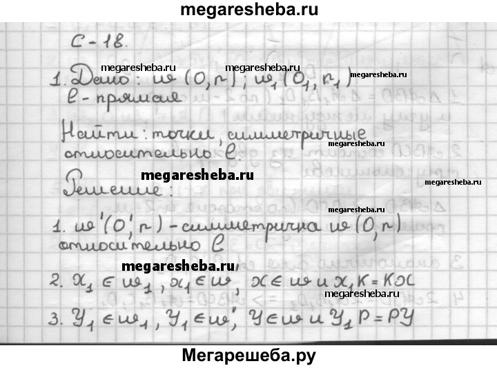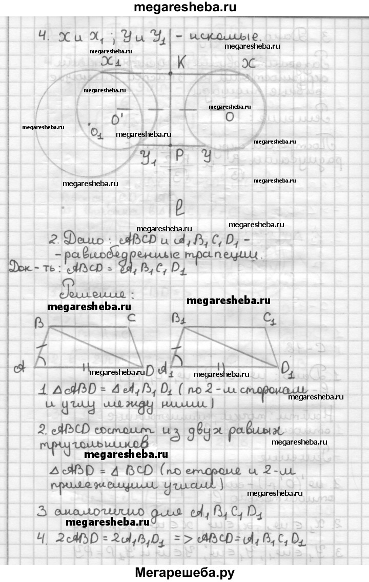 С—18 1. На рисунке 41 изображены две окружности и прямая I. Найдите на этих окружностях точки, симметричные друг другу относительно прямой I. 2. Докажите, что равнобедренные трапеции ABCD и A1B1C1D1 (АВ и CD — основания) равны, если АВ = = А1В1, AD = A1D1 и ∠BAD = ∠B1A1D1. 45