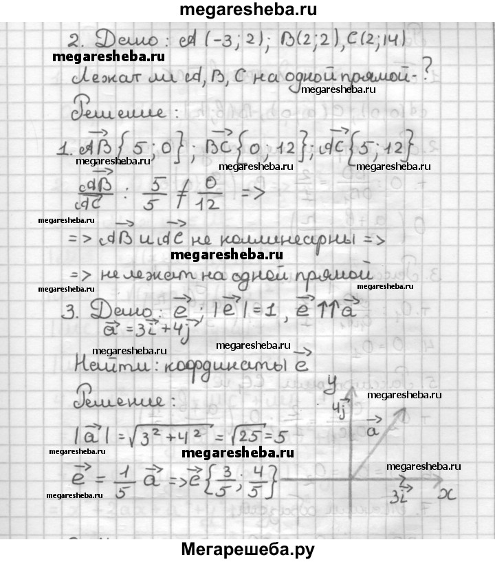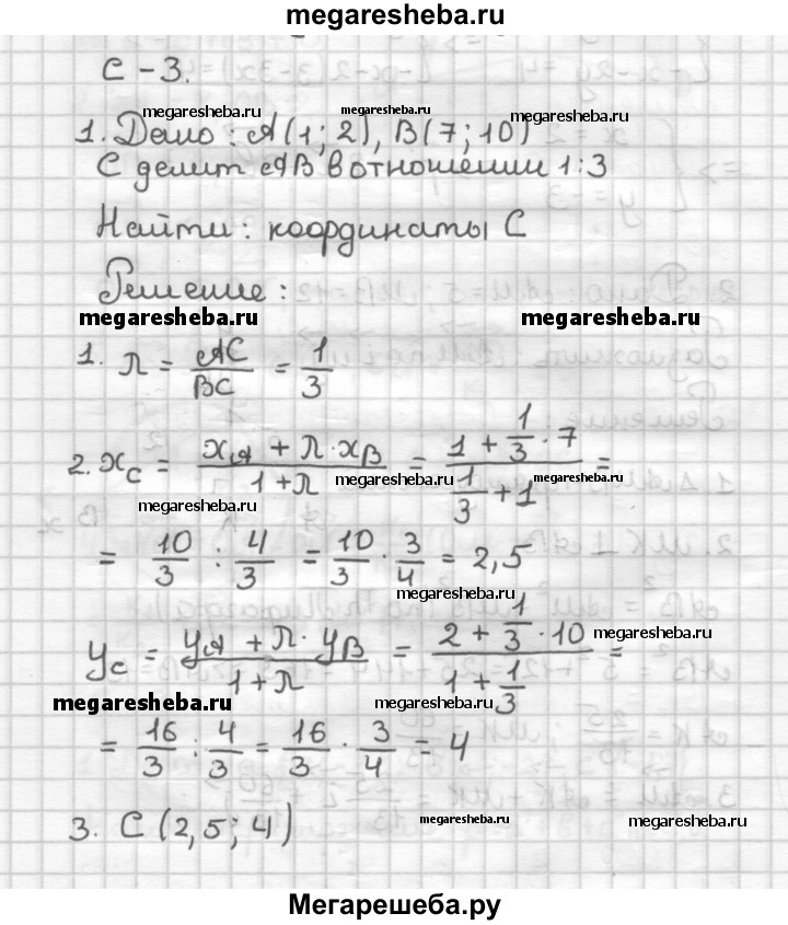 С—3 1. Точки А и В имеют координаты А(1; 2), В(7; 10). Найдите координаты точки С, делящей отрезок АВ в отношении 1 : 3, считая от точки А. 2. Лежат ли точки А(-3; 2), В(2; 2) и С (2; 14) на одной прямой? 3. Найдите координаты единичного вектора е (|е| = 1), сонаправленного с вектором a =3i +4у.