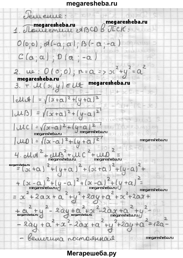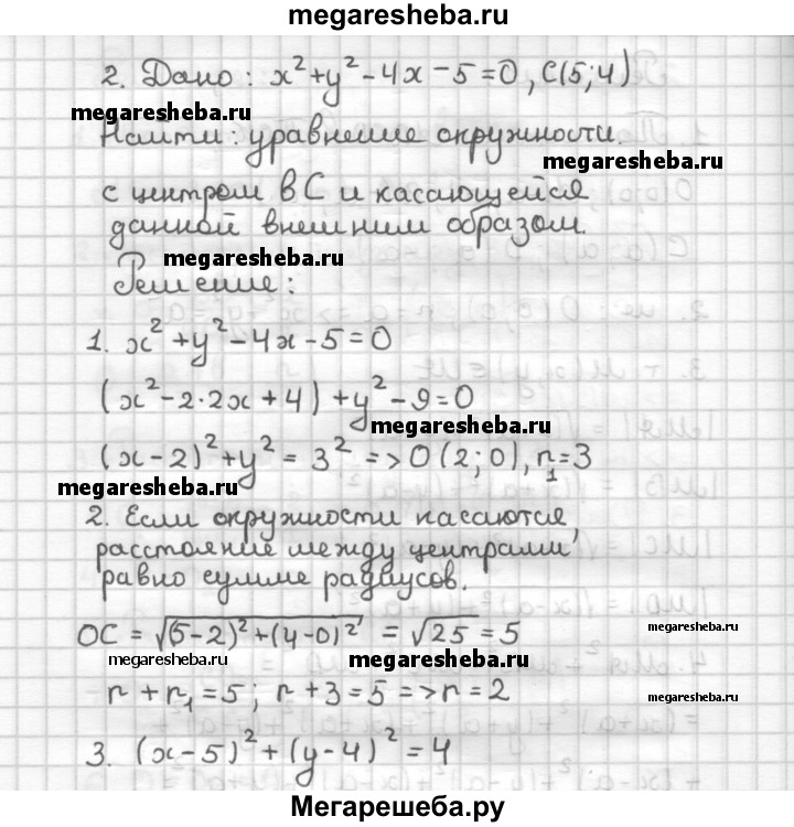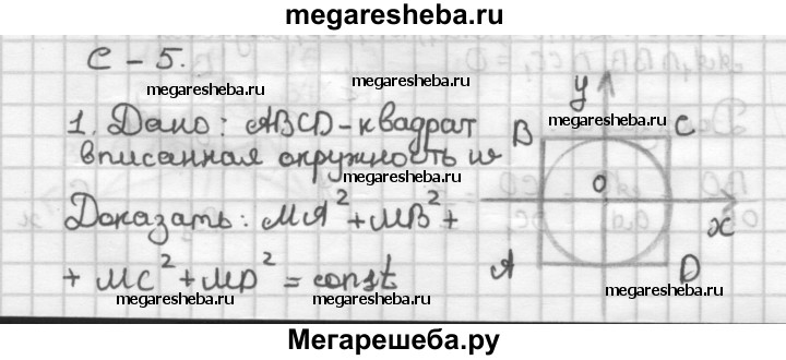 С—5 1. В квадрат вписана окружность. Докажите, что сумма квадратов расстояний от любой точки окружности до вершин квадрата есть величина постоянная. 2. Даны окружность х2 + у2 - 4х - 5 = 0 и точка С(5; 4). Напишите уравнение окружности, имеющей центр в данной точке и касающейся данной окружности внешним образом.
