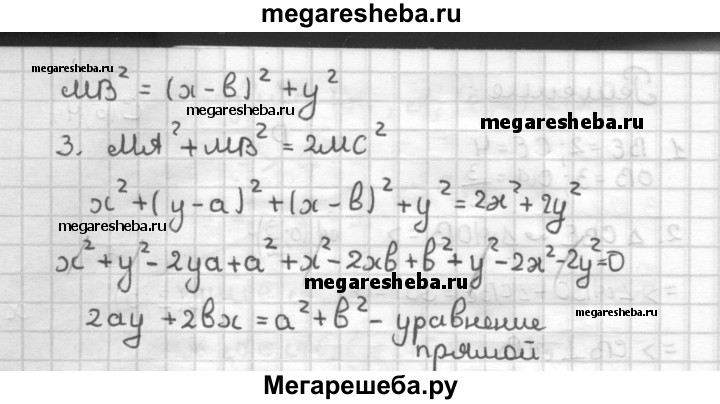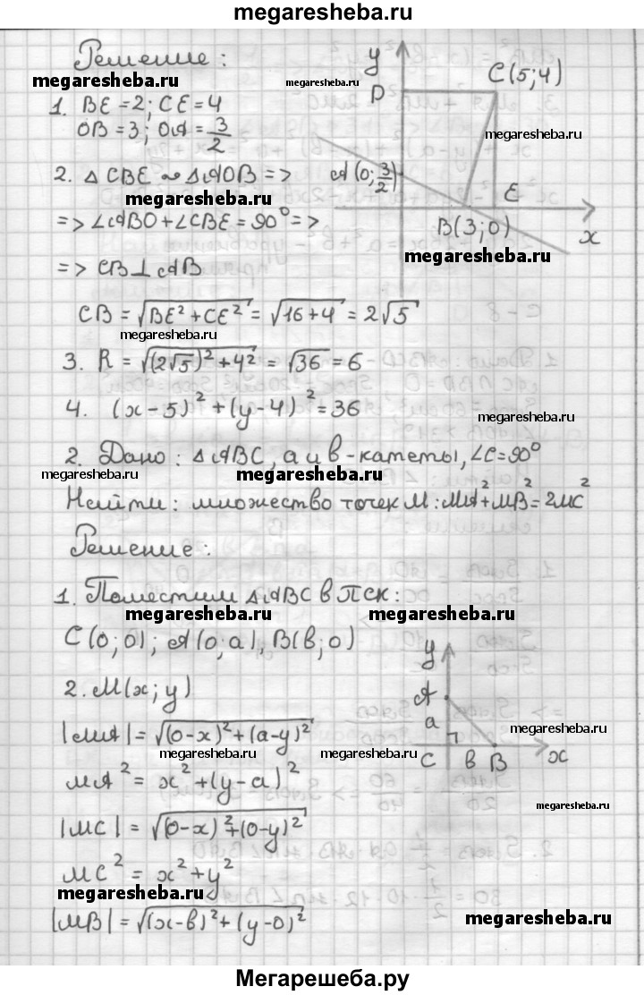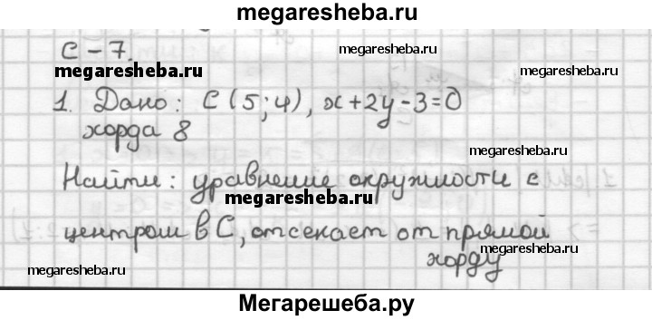 С—7 1. Составьте уравнение окружности, если ее центр находится в точке С (5; 4) и окружность отсекает от прямой х + 2у - 3 = 0 хорду, длина которой равна 8. 2. Дан прямоугольный треугольник ABC с катетами а и Ь (∠C - 90°). Найдите множество точек М, для которых MA2 + MB2 = 2МС2.