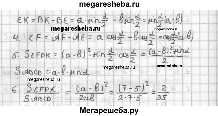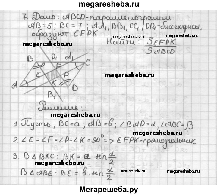 7. В параллелограмме ABCD АВ = 5, ВС = 7. Биссектрисы внутренних углов, пересекаясь, образовали четырехугольник. Найдите отношение площади четырехугольника к площади параллелограмма.