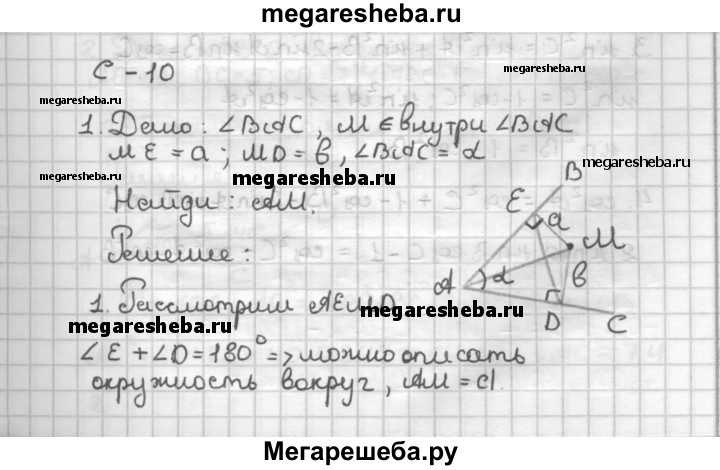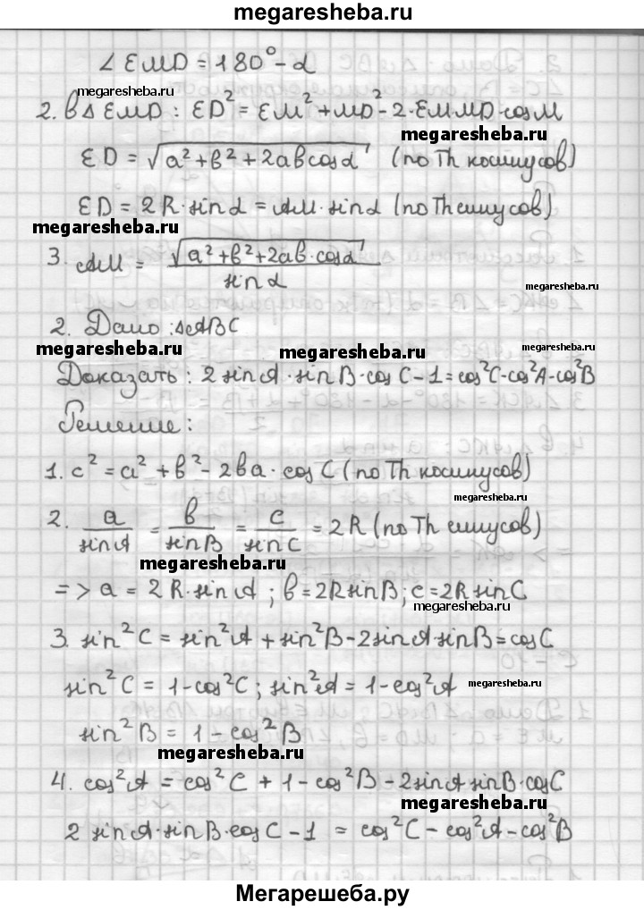 С—10 1. Дан угол ВАС. Внутри него выбрана точка М, удаленная от сторон угла на расстояния а и b. Найдите AM, если ∠BAC = а, 2. Докажите, что в любом треугольнике углы А, В и С связаны соотношением 2 sin A sin В cos С - 1 = cos2 С - cos2 А - cos2 В.