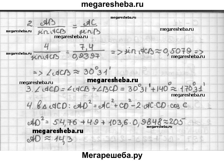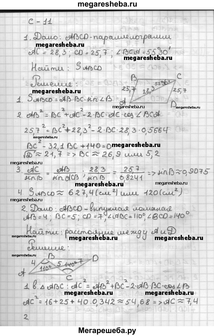 С—11 1. В параллелограмме ABCD АС = 28,3, CD = 25,7, ∠BCA = = 55°30'. Найдите площадь параллелограмма. 2. ABCD — выпуклая ломаная линия. АВ = 4, ВС = 5, CD = 7, ∠ABC = 110°, ∠BCD = 140°. Найдите расстояние между точками А и D.