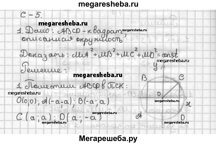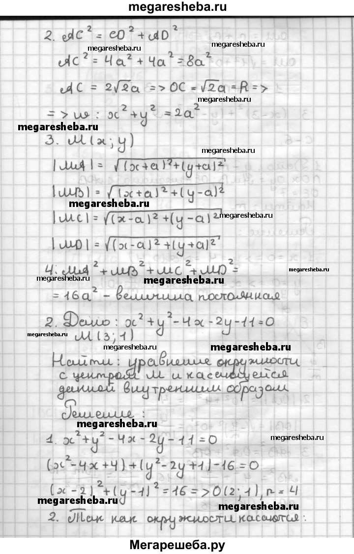 С—5 1. Около квадрата описана окружность. Докажите, что сумма квадратов расстояний от точки окружности до вершин квадрата не зависит от выбора точки на окружности. 2. Даны окружность х2 + у2 - 4х - 2 - 11 = 0 и точка М (3; 1). Напишите уравнение окружности, имеющей центр в данной точке и касающейся данной окружности внутренним образом.