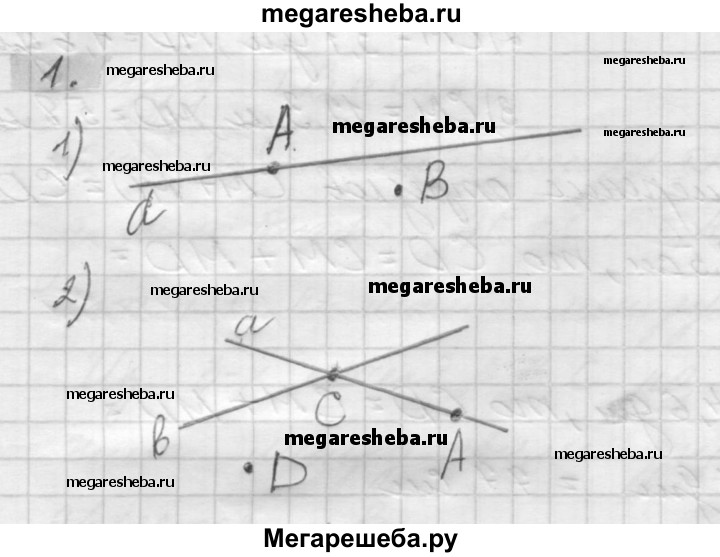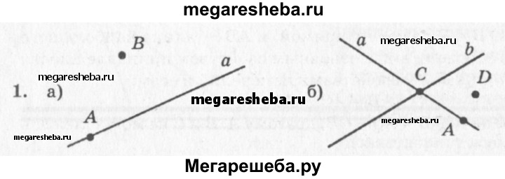 1. 1) Проведите прямую. Отметьте какую-нибудь точку А, лежащую на прямой, и точку В, не лежащую на прямой. 2) Проведите две пересекающиеся прямые а и b. Отметьте точку С пересечения прямых; точку А на прямой а, не лежащую на прямой b; точку D, не лежащую ни на одной из прямых а и b.