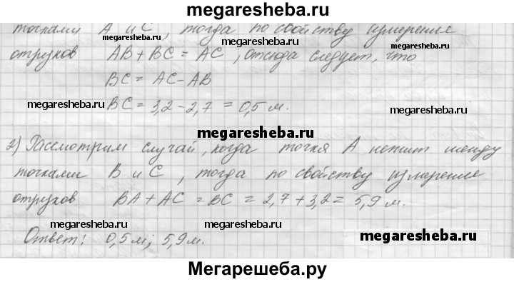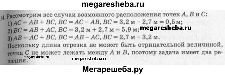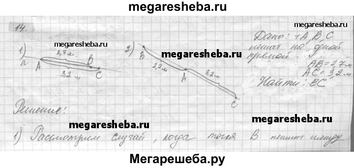 14. Точки А, В, С лежат на одной прямой. Найдите длину отрезка ВС, если АВ — 2,7 м, АС = 3,2 м. Сколько решений имеет задача?