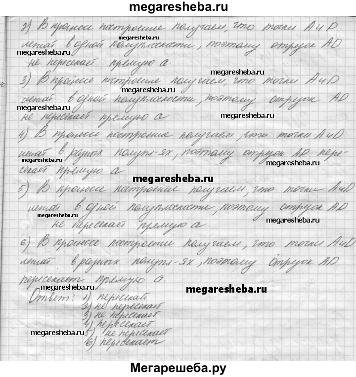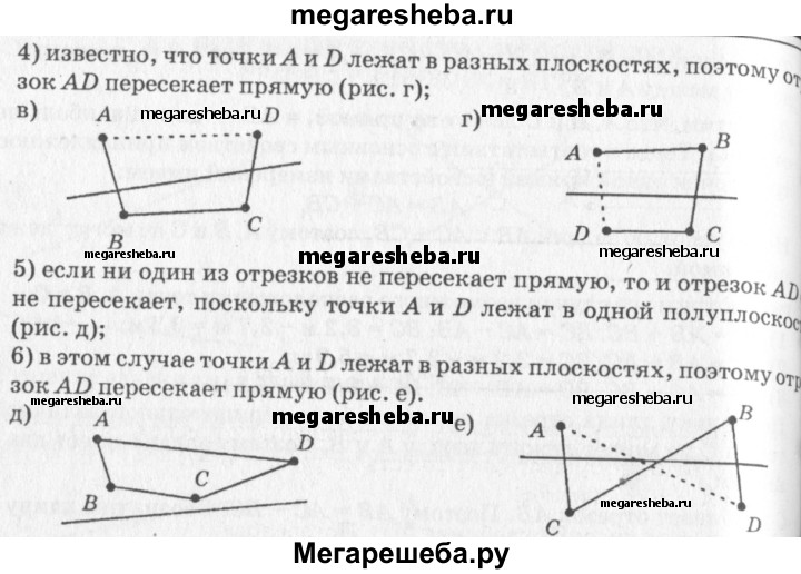 18. Даны прямая и четыре точки А, В, С и D, не лежащие на этой прямой. Пересекает ли прямую отрезок AD, если: 1) отрезки АВ, ВС и CD пересекают прямую; 2) отрезки АС и ВС пересекают прямую, а отрезок BD не пересекает; 3) отрезки АВ и CD пересекают прямую, а отрезок ВС не пересекает; 4) отрезки АВ и CD не пересекают прямую, а отрезок ВС пересекает; 5) отрезки АВ, ВС, CD не пересекают прямую; 6) отрезки АС, ВС и BD пересекают прямую? Объясните ответ.