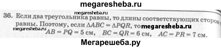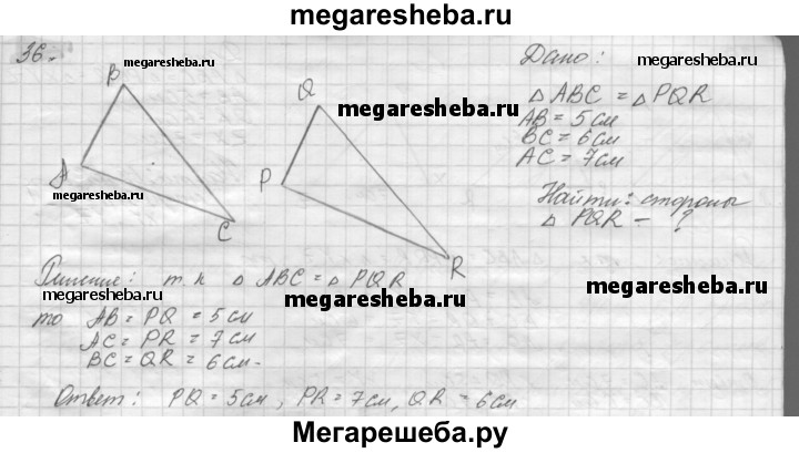 36. Треугольники ABC и PQR равны. Известно, что АВ = 5 см, ВС = 6 см, АС = 7 см. Найдите стороны треугольника PQR. Объясните ответ.
