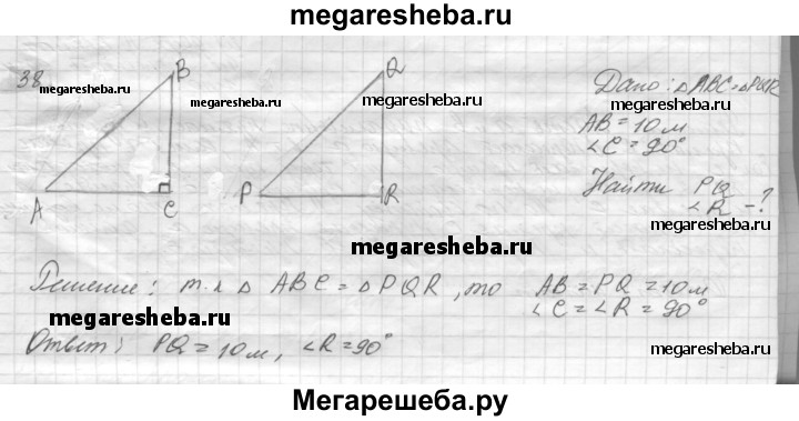 38. Треугольники ABC и PQR равны. Известно, что сторона АВ равна 10 м, а угол С равен 90°. Чему равны сторона PQ и угол R? Объясните ответ.
