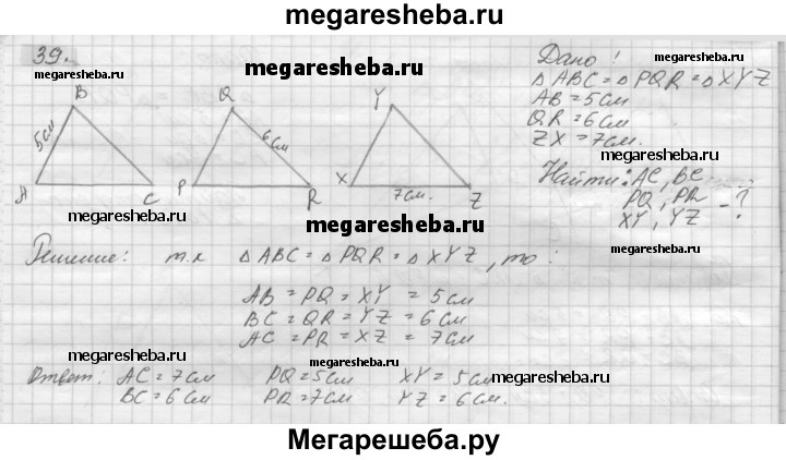 39. Треугольники ABC, PQR и XYZ равны. Известно, что АВ — = 5 см, QR = 6 см, ZX = 7 см. Найдите остальные стороны каждого треугольника.