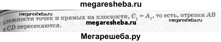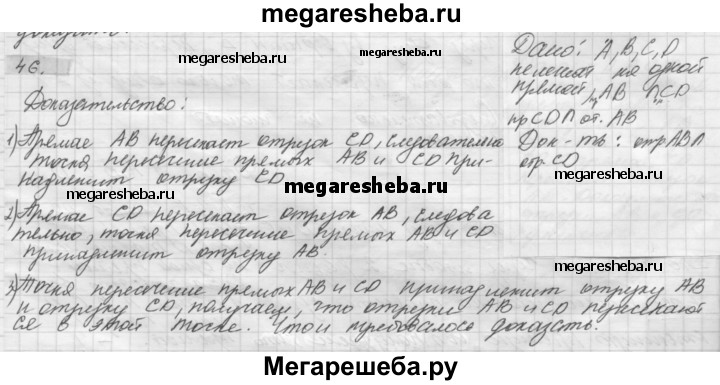 46. Точки А, В, С, D не лежат на одной прямой. Известно, что прямая АВ пересекает отрезок CD, а прямая CD пересекает отрезок АВ. Докажите, что отрезки АВ и CD пересекаются.
