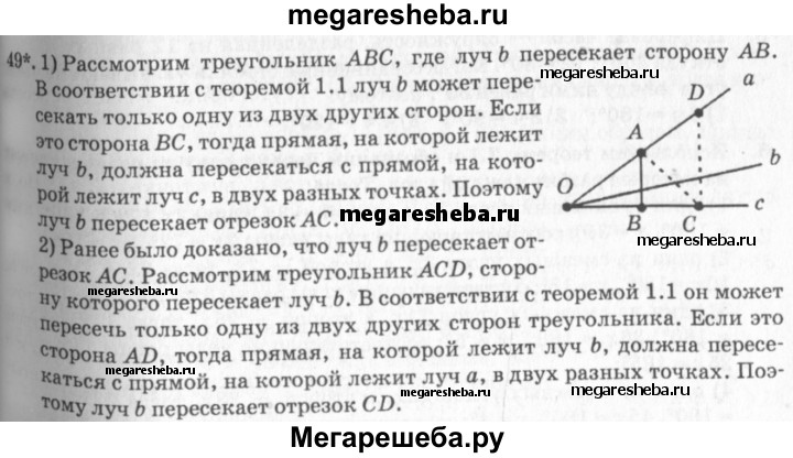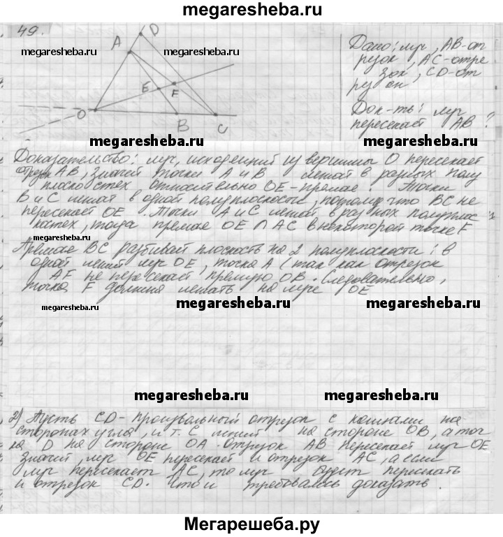 49. Докажите, что если луч, исходящий из вершины угла, пересекает отрезок АВ с концами на сторонах угла, то он пересекает: 1) отрезок АС с концами на сторонах угла; 2) любой отрезок CD с концами на сторонах угла (рис. 30).