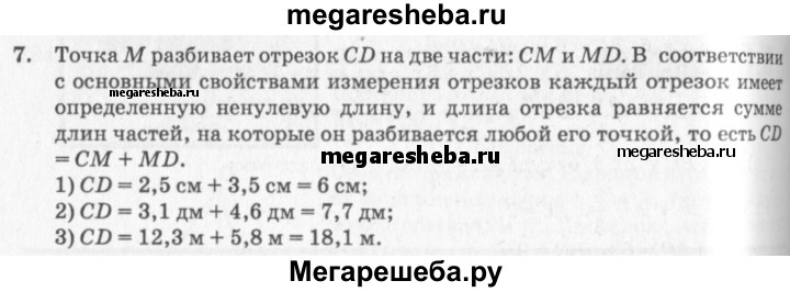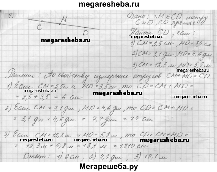 7. Точка М лежит на прямой CD между точками С и D. Найдите длину отрезка CD, если: 1) СМ = 2,5 см, MD = 3,5 см; 2) СМ = 3,1 дм, MD = 4,6 дм; 3) СМ = 12,3 м, MD = 5,8 м.