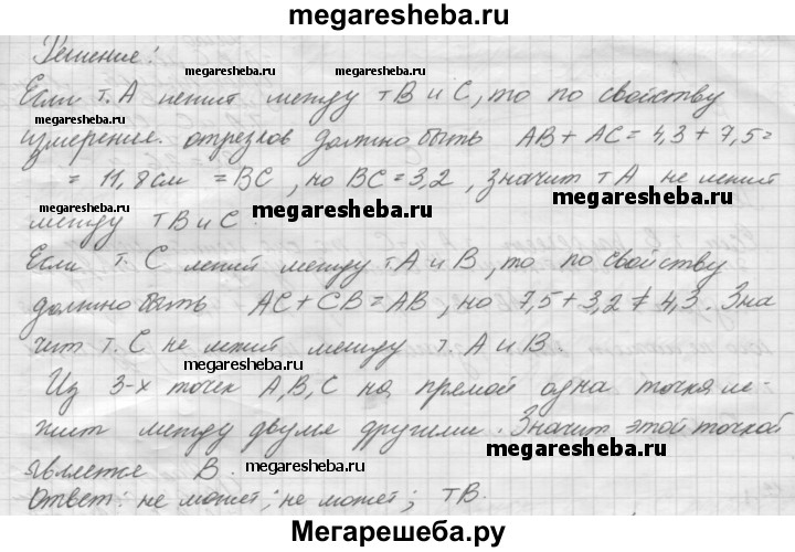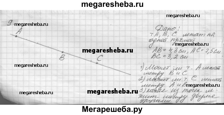 9. Точки А, В, С лежат на одной прямой. Известно, что АВ= 4,3 см, АС = 7,5 см, ВС = 3,2 см. Может ли точка А лежать между точками В и С? Может ли точка С лежать между точками А и В? Какая из точек А, В, С лежит между двумя другими?