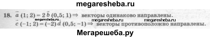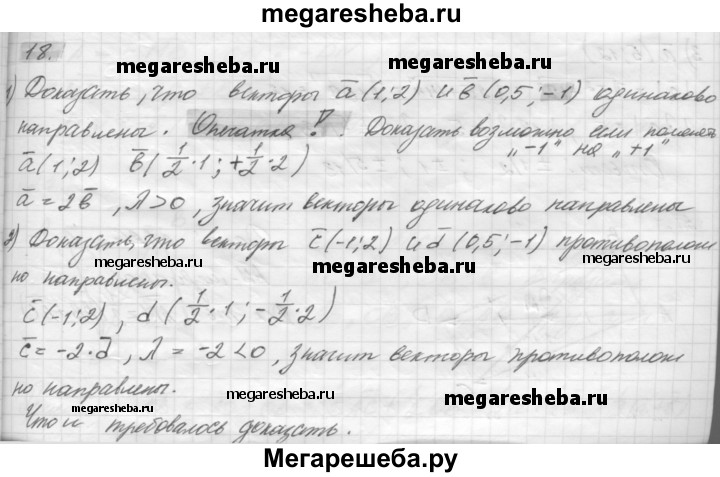 18. Докажите, что векторы а (1; 2)_и b (0,5; -1) одинаково направлены, а векторы с (-1; 2) и d (0,5; -1) противоположно направлены.