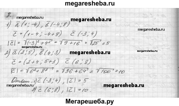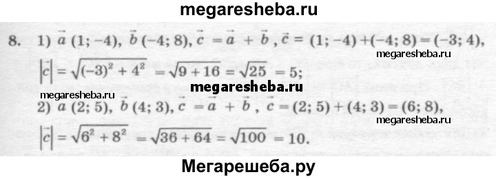 8. Найдите вектор с, равный сумме векторов а и b, и абсолютную величину вектора с, если: 1) а (1; -4), b (-4; 8); 2) а (2; 5), Ь (4; 3).