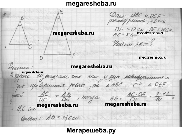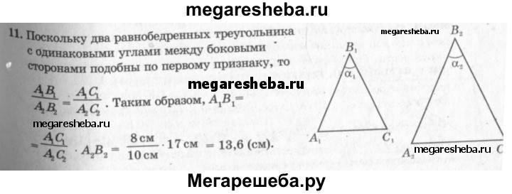 11. У двух равнобедренных треугольников углы между боковыми сторонами равны. Боковая сторона и основание одного треугольника равны 17 см и 10 см, основание другого равно 8 см. Найдите его боковую сторону.