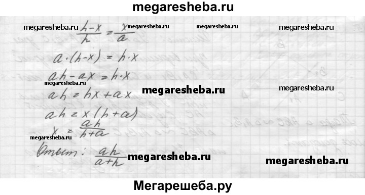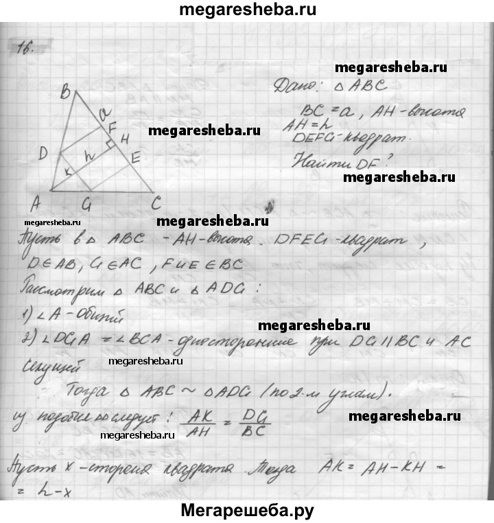 16. В треугольник с основанием а и высотой h вписан квадрат так, что две его вершины лежат на основании треугольника, а другие две — на боковых сторонах (рис. 257). Вычислите сторону квадрата.