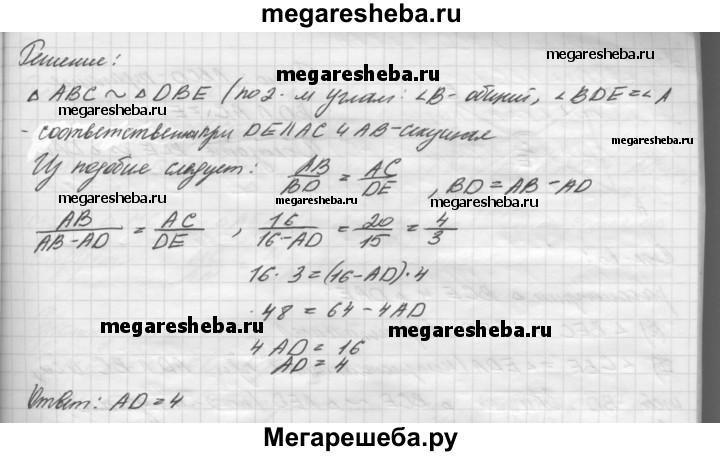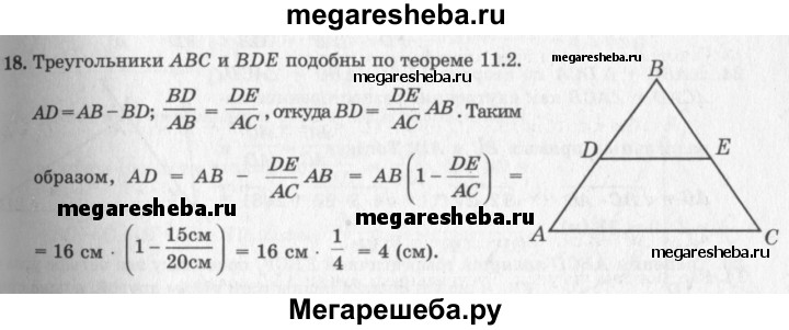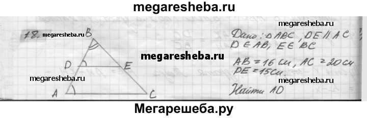 18. В треугольнике ABC проведён отрезок DE, параллельный стороне АС (конец D отрезка лежит на стороне АВ, а Е — на стороне ВС). Найдите AD, если АВ = 16 см, АС = 20 см и DE = 15 см.