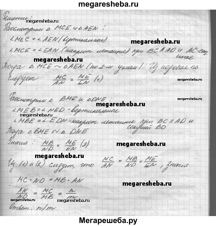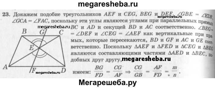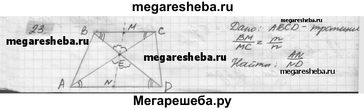 23. Прямая, проходящая через точку пересечения диагоналей трапеции, делит одно основание в отношении т : п. В каком отношении она делит другое основание?