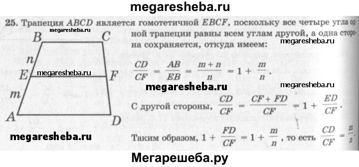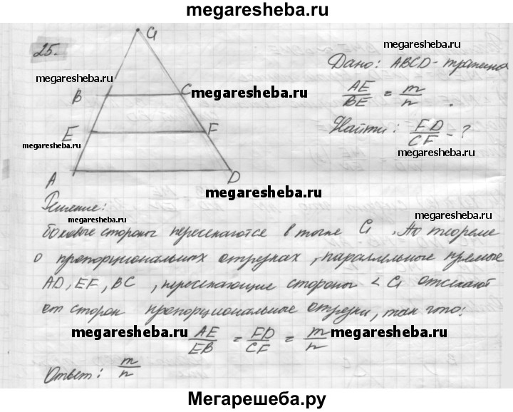 25. Линия, параллельная основаниям трапеции, делит одну боковую сторону в отношении т : п. В каком отношении делит она другую боковую сторону?