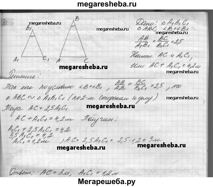 30. Стороны треугольника ABC, прилежащие к углу В, в 2,5 раза больше сторон треугольника А1В1С1, прилежащих к углу В1. Углы В и B1 равны. Найдите АС и А1С1, если их сумма равна 4,2 м.