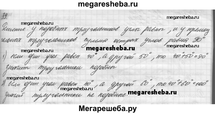 39. Подобны ли два прямоугольных треугольника, если у одного из них есть угол 40°, а у другого угол, равный: 1) 50°; 2) 60°?